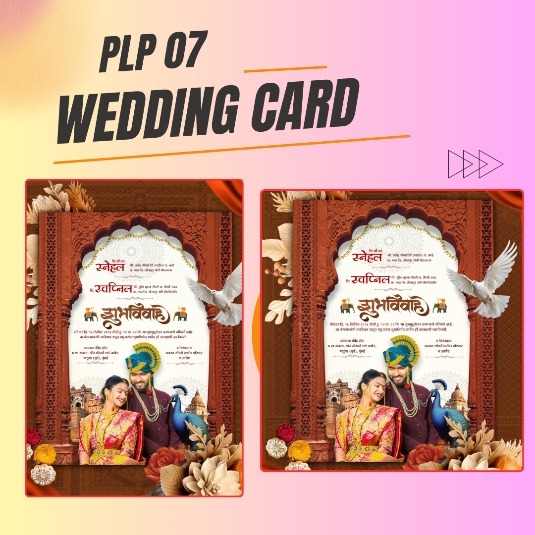 This Traditional Marathi Wedding Invitation Card Template is designed with a royal arch frame, intricate floral details, and authentic Marathi typography to reflect the essence of a traditional Hindu wedding. The background showcases ornate temple pillars, magnolia flowers, and cultural elements like peacock feathers and golden dagger accents — symbolizing prosperity and purity.